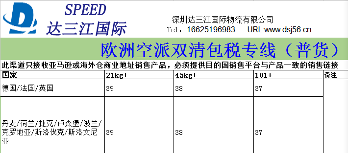 深圳达三江国际物流有限公司7月份美国空派双清包税价格表